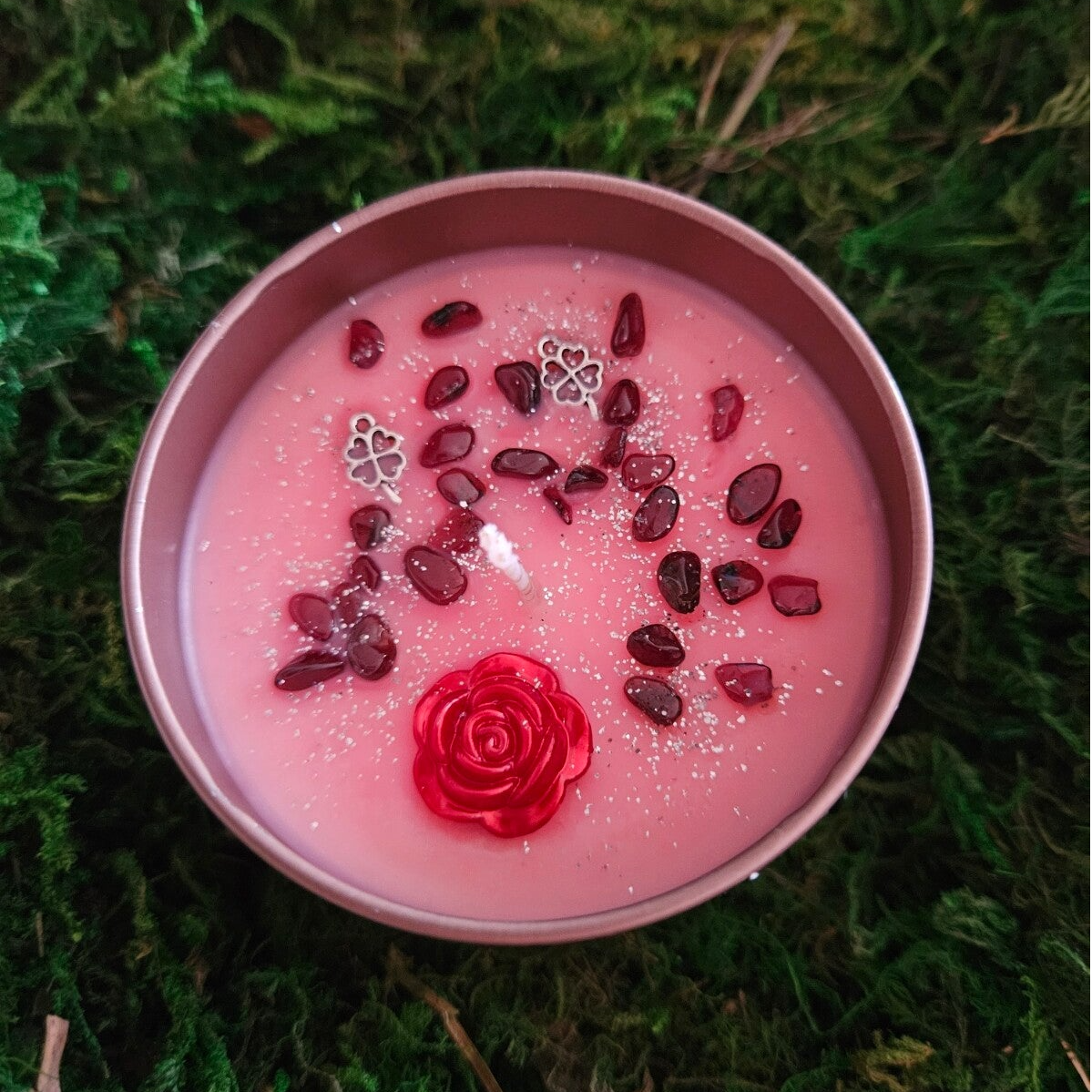 Material: 100% qualitativ hochwertiges Sojawachs (vegan und frei von Tierversuchen), Dekoelemente (Glitter, Glitzer, Steine, Kleeblatt, Rose)