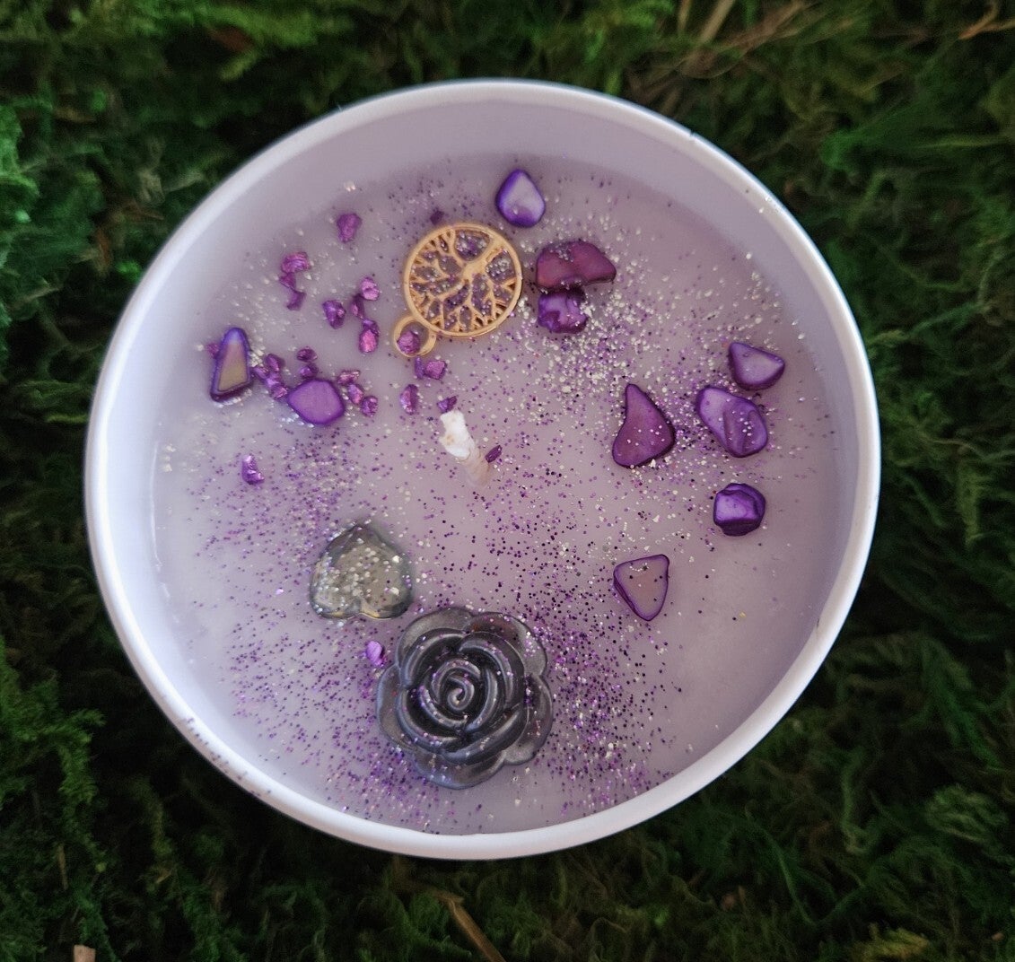 Material: 100% qualitativ hochwertiges Sojawachs (vegan und frei von Tierversuchen), Dekoelemente (Glitter, Glitzer, Steine, Lebensbaum, Rose)
