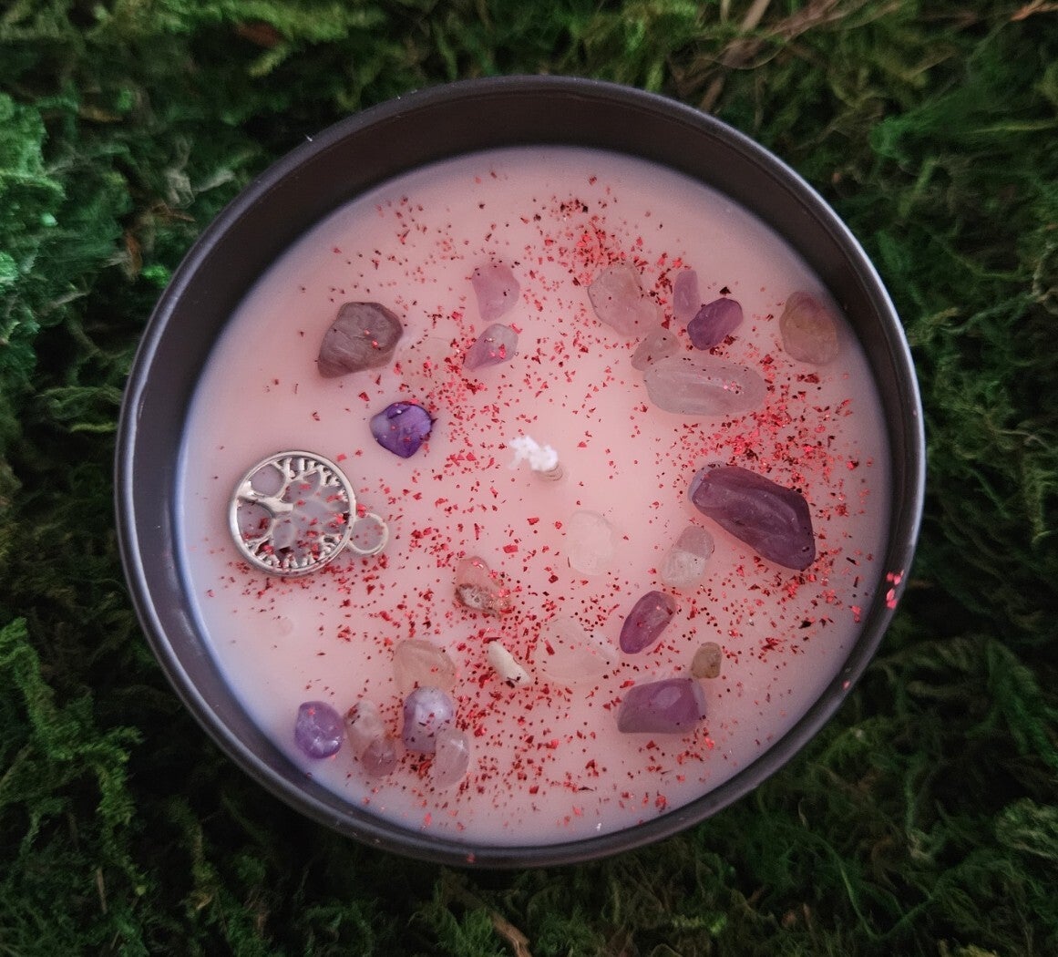 Material: 100% qualitativ hochwertiges Sojawachs (vegan und frei von Tierversuchen), Dekoelemente (Glitter, Glitzer, Steine, Lebensbaum)