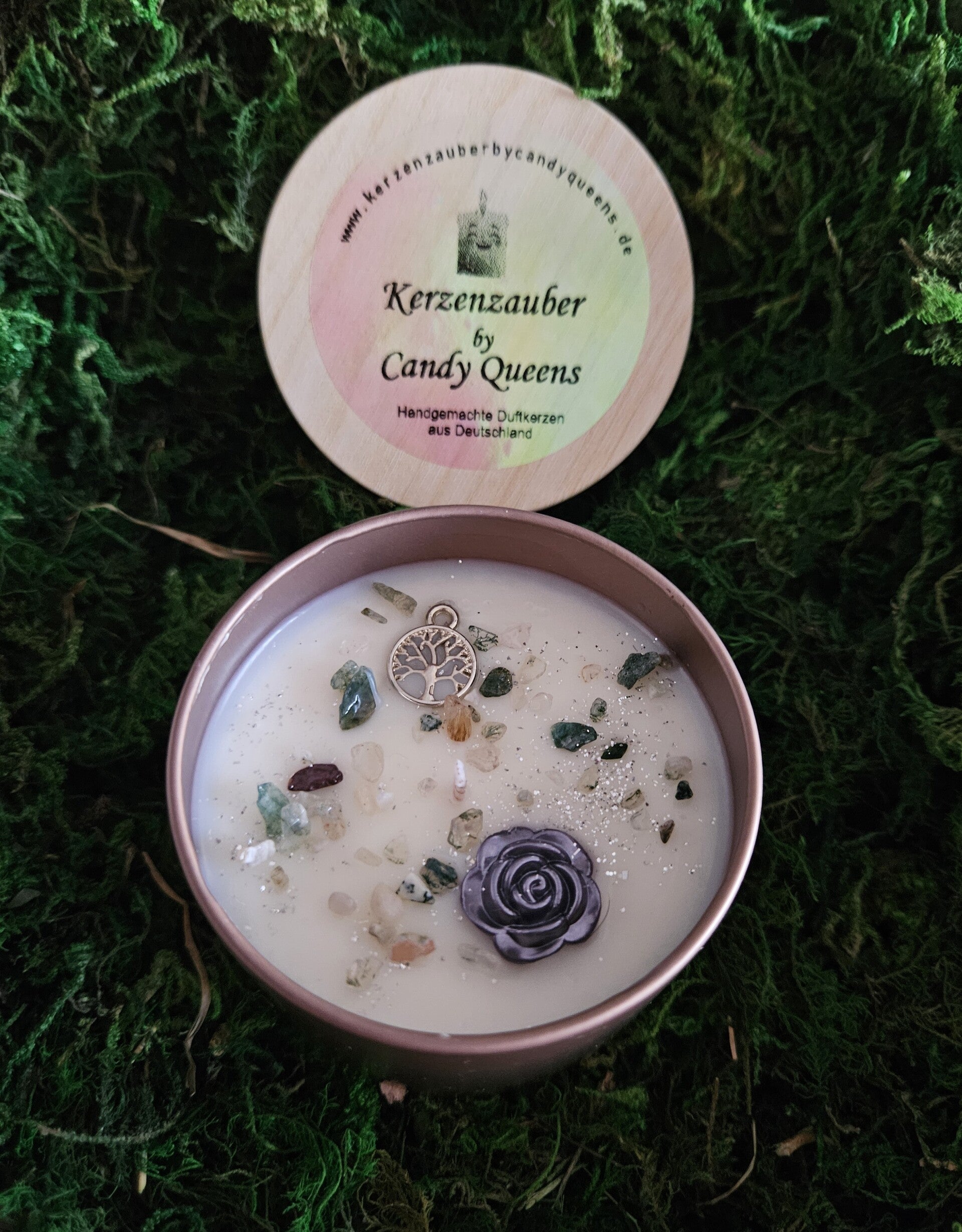 Material: 100% qualitativ hochwertiges Sojawachs (vegan und frei von Tierversuchen), Dekoelemente (Glitter, Glitzer, Steine, Lebensbaum, Rose)