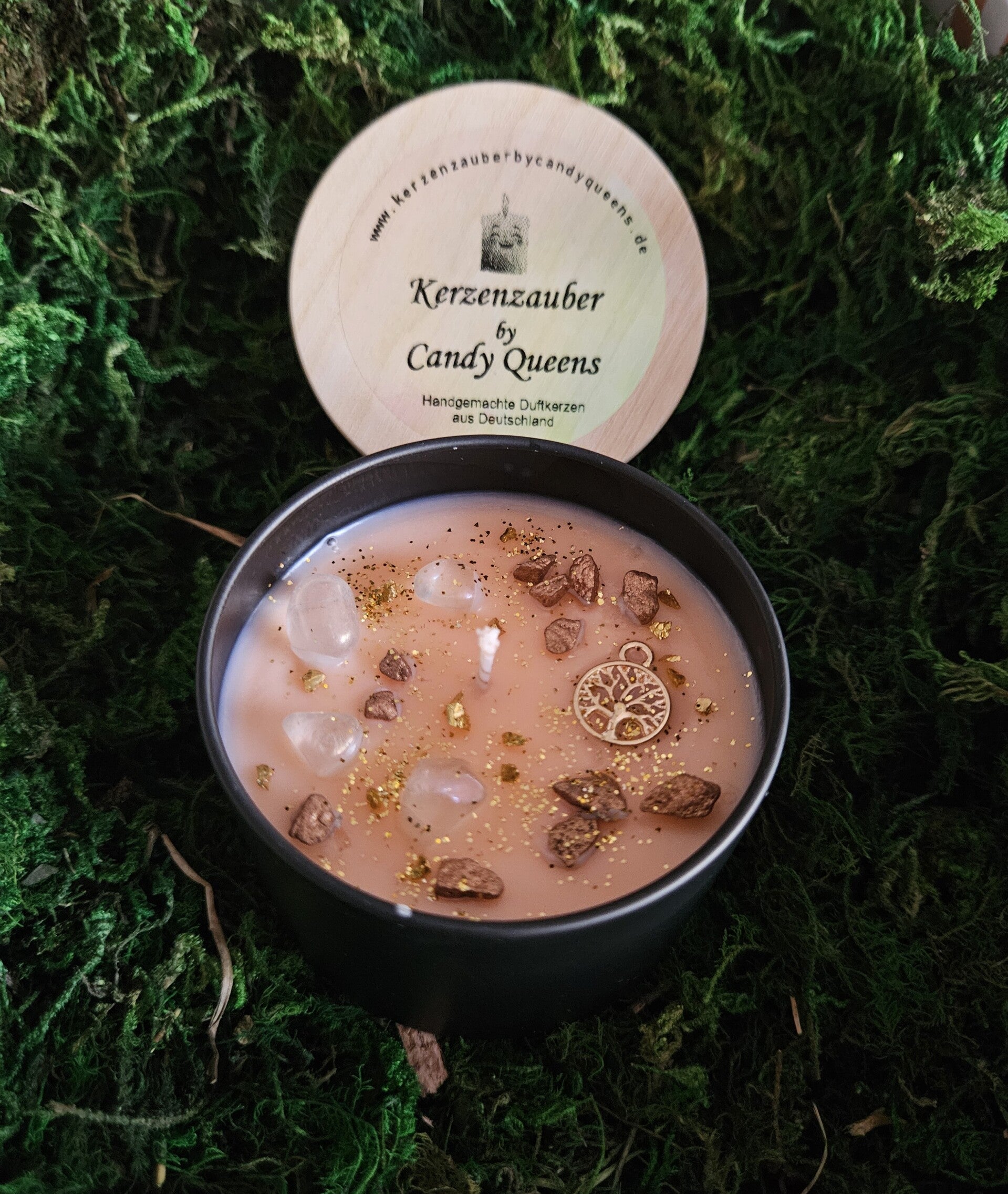 Material: 100% qualitativ hochwertiges Sojawachs (vegan und frei von Tierversuchen), Dekoelemente (Glitter, Glitzer, Steine, Lebensbaum)